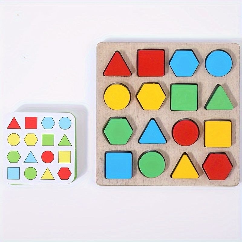 - Laps valib pakist ühe kaardi, mille järgi paneb kujundid vastavatesse aukudesse. Seeläbi tegeletakse lapse visuaalse taju arendamisega.